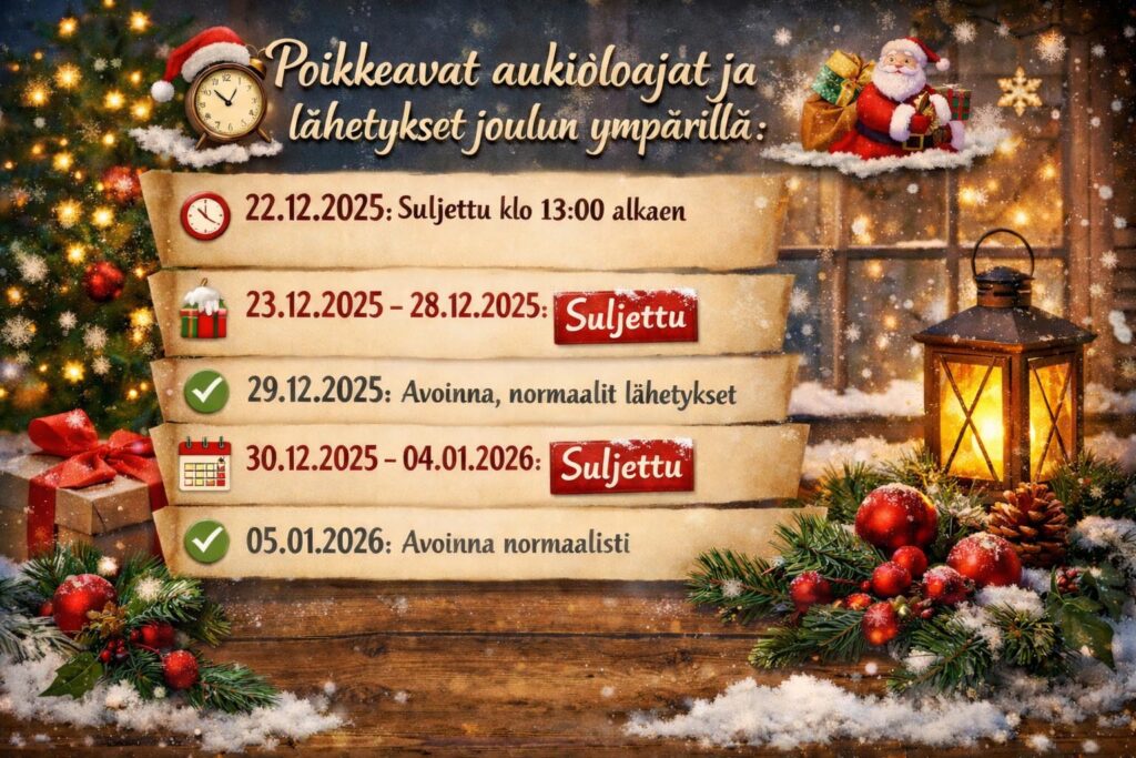 Poikkeavat aukioloajat ja lähetykset joulun ympärillä: 22.12.2025: Suljettu klo 13:00 alkaen, viimeinen lähetys klo 12:0023.12.2025 – 28.12.2025: Suljettu29.12.2025: Avoinna, normaalit lähetykset30.12.2025 – 04.01.2026: Suljettu05.01.2026: Avoinna normaalisti Hyvää joulua ja turvallisia kilometrejä kaudelle 2026! - Heidenau K58 – Skootterit ja mopot